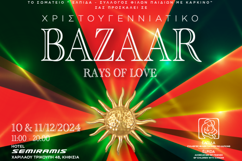 Για μια ακόμα χρονιά, το Σωματείο «ΕΛΠΙΔΑ -Σύλλογος Φίλων Παιδιών με καρκίνο», διοργανώνει το πιο χριστουγεννιάτικο Bazaar της πόλης! Την Τρίτη 10 και την Τετάρτη 11 Δεκεμβρίου 2024 στο ξενοδοχείο «SEMIRAMIS» στο Κεφαλάρι από τις 11 το πρωί μέχρι τις 8 το βράδυ ανοίγουμε την αγκαλιά μας και στηρίζουμε τα παιδιά με καρκίνο και τις οικογένειές τους.