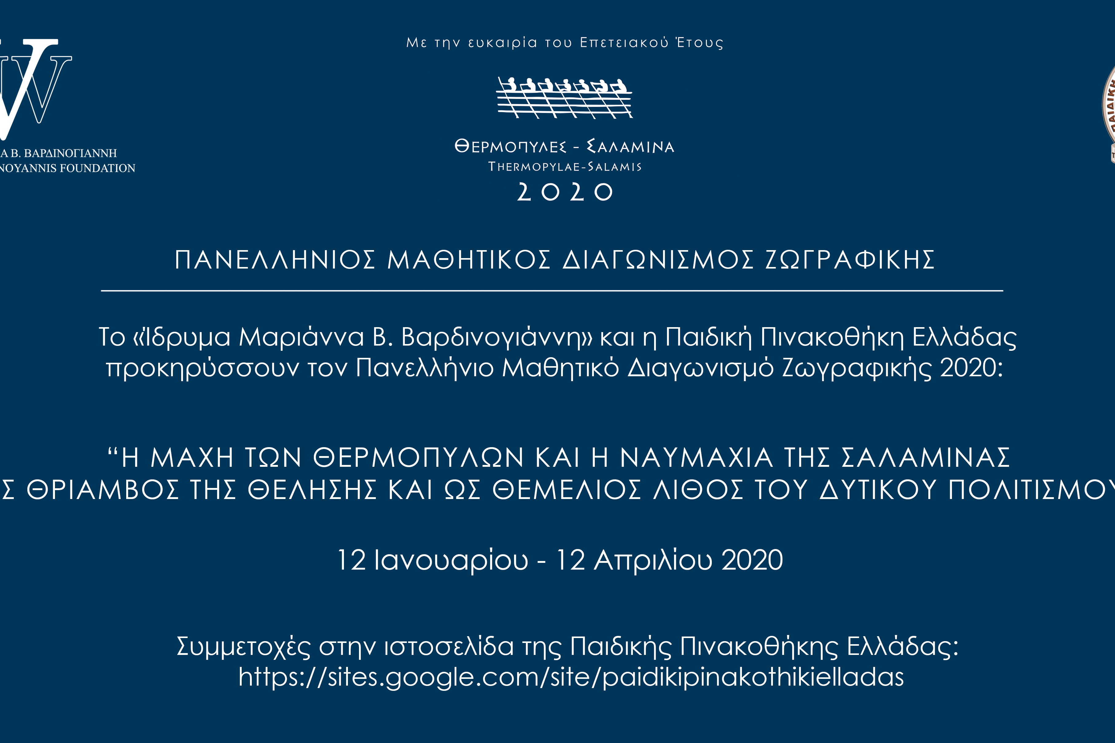 Με αυτή την κίνηση υψηλού συμβολισμού το Ίδρυμα «Μαριάννα Β. Βαρδινογιάννη» ξεκινά τις δράσεις του με τον Πανελλήνιο Διαγωνισμό Ζωγραφικής για παιδιά Δημοτικού με θέμα: «Η Μάχη των Θερμοπυλών και η Ναυμαχία της Σαλαμίνας ως θρίαμβος της θέλησης και ως ο θεμέλιος λίθος του Δυτικού πολιτισμού», θέλοντας να στείλει ένα δυνατό μήνυμα πως οι ιδέες και εορτασμοί της Επετείου των 2500 χρόνων από τις δύο αυτές επικές στιγμές για τη χώρα μας, την Ευρώπη και ολόκληρο τον κόσμο θα πρέπει πρωτίστως να αφορούν και να γίνουν κτήμα της νέας γενιάς, τόσο στην Ελλάδα, όσο και στην ομογένεια.