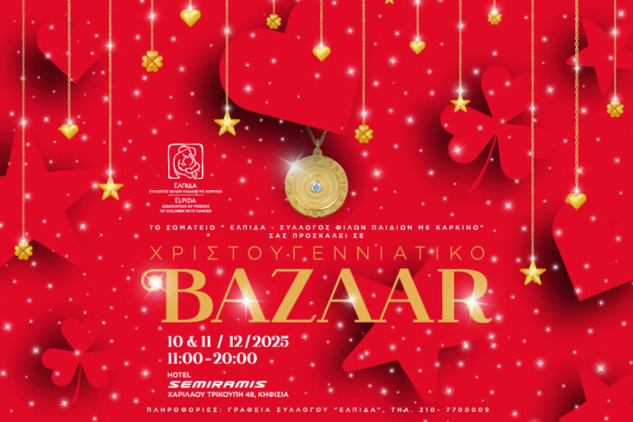 Το Σωματείο «ΕΛΠΙΔΑ – Σύλλογος Φίλων Παιδιών με καρκίνο» σας προσκαλεί με χαρά και φέτος στο πιο χριστουγεννιάτικο Bazaar της πόλης!   Την Τετάρτη 10 και την Πέμπτη 11 Δεκεμβρίου 2025, στο ξενοδοχείο «SEMIRAMIS» στο Κεφαλάρι, από τις 11 το πρωί μέχρι τις 8 το βράδυ ανοίγουμε την αγκαλιά μας και στηρίζουμε τα παιδιά με καρκίνο…